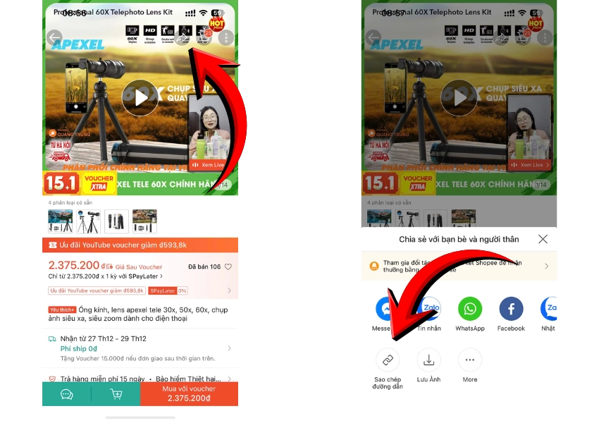 - Sau khi mở trang chi tiết sản phẩm tại đây chọn biểu tượng mũi tên chia sẻ ở góc trên bên phải màn hình >> chọn Sao chép đường dẫn