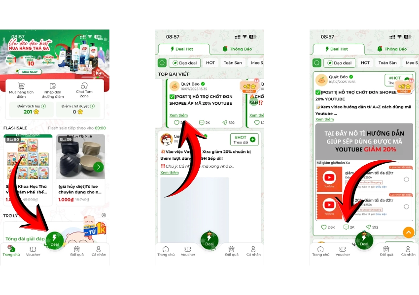 - Tiếp theo Mở ứng dụng Nô Tì >> chọn Deal >> Chọn mục Xem thêm tại bài Post 1 Hỗ trợ chốt đơn Shopee áp mã Youtube 20% được Ghim ở mục Top bài viết trên đầy trang. Tiếp theo chọn biểu tượng bình luận tại bài Post như hướng dẫn trong hình dưới.