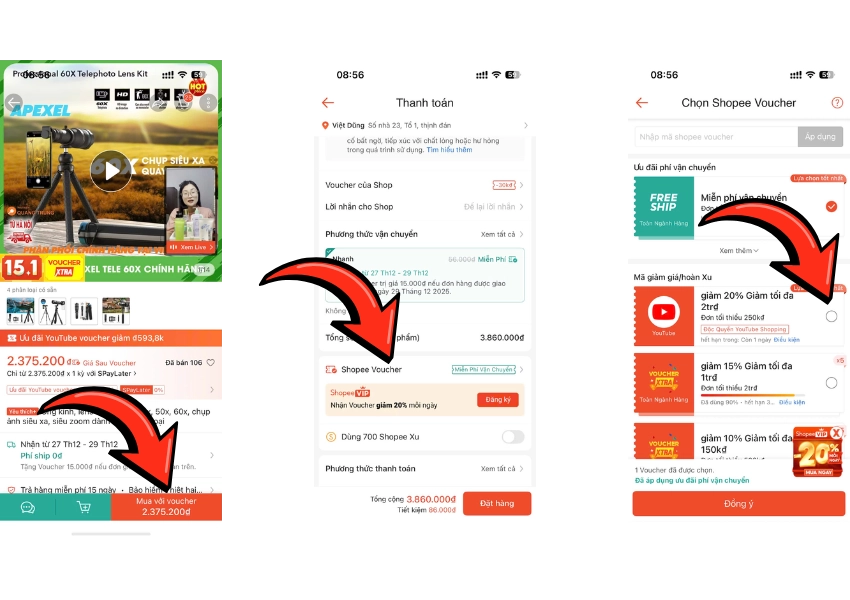 - Sau khi được chuyển hướng về Shopee >> chọn Mua với Voucher >> chọn phân loại sản phẩm >> Bấm Mua ngay >> nhanh tay ấn Shopee Voucher, tích chọn Voucher giảm 20% hiện ra rồi bấm Đồng ý, áp Shopee Xu nếu có và nhấn Đặt hàng.