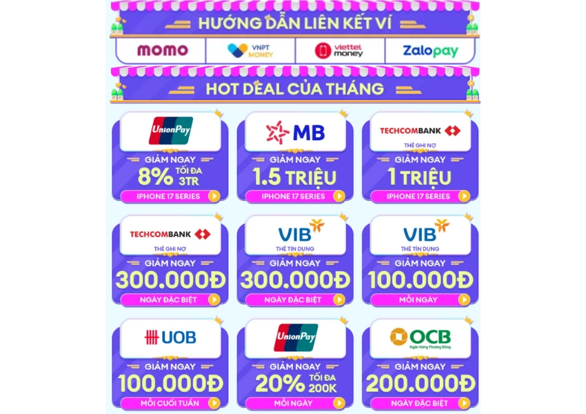 - Giảm 1.5 triệu cho tất cả sản phẩm iPhone 17 Series khi thanh toán đơn hàng trả góp iPhone 17 bằng thẻ tín dụng MB Bank tại Apple Flagship Store. Thời gian từ 19.09 – 31.12.2025.