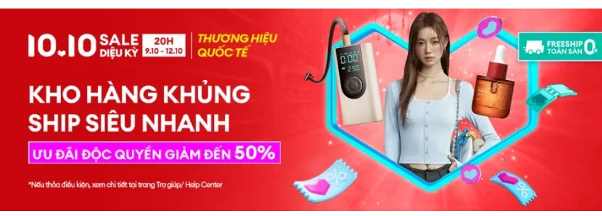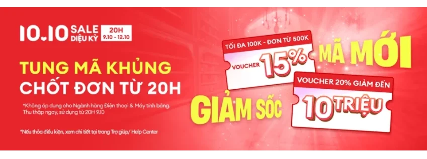 - Giai đoạn bùng nổ: Bắt đầu từ 20h ngày 9.10 đến hết ngày 12.10 (quan trọng Sale sẽ bùng nổ mạnh, các sản phẩm giảm giá cực sâu, combo trợ giá, trợ xu lên đến 50% cùng rất nhiều chương trình và Flash Sale hấp dẫn đi kèm sẽ diễn ra trong 28h đầu từ 20h 9.10 đến hết 10.10): Trong thời gian này các Voucher trước đó bạn thu thập sẽ có hiệu lực, các sản phẩm được trợ giá giảm mạnh, cơ hội để các bạn nhanh tay chốt Deal ngay mang về những sản phẩm yêu thích với giá cực hời nhé.