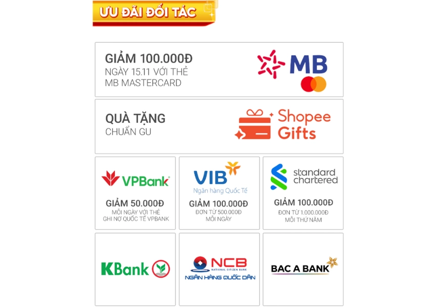 Ngoài các ưu đãi từ Shopee các bạn còn có thể áp dụng các Voucher từ đối tác thanh toán để giảm giá tối đa cho đơn hàng của mình nữa đó. Tham khảo ngay các ưu đãi thanh toán dưới đây nhé: