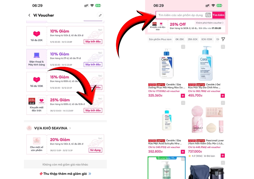 Sau khi nhấn Sử dụng bạn sẽ được chuyển hướng tới List sản phẩm áp dụng được Voucher. Lúc này bạn có thể lướt lần lượt danh sách hoặc nhấn vào thanh tìm kiếm ở trên cùng trang và nhập tên sản phẩm bạn muốn mua rồi nhấn tìm kiếm là được.